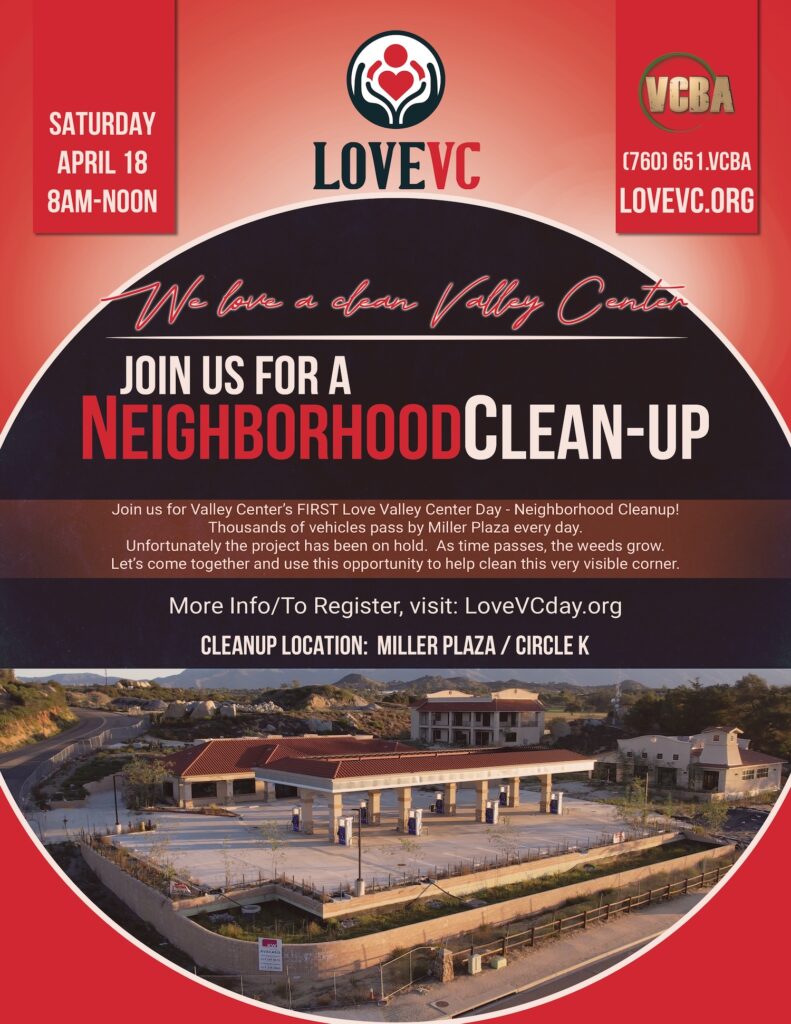 Neighborhood Clean-up JOIN THE MOVEMENT: LOVE VALLEY CENTER DAY! Get ready to make a difference in our community! We’re hosting a neighborhood cleanup on Saturday, April 18, and we need YOUR help! Let’s show some love to Valley Center and keep our town clean and beautiful! Join us for the first ever Love Valley Center…Find Out More